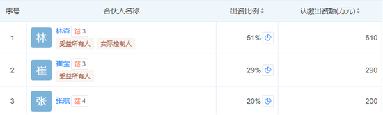 取而代之的,是三位自然人股东:林森、崔莹、张航。三人分别出资510万元、290万元、200万元人民币,持股比例依次为51%、29%和20%。